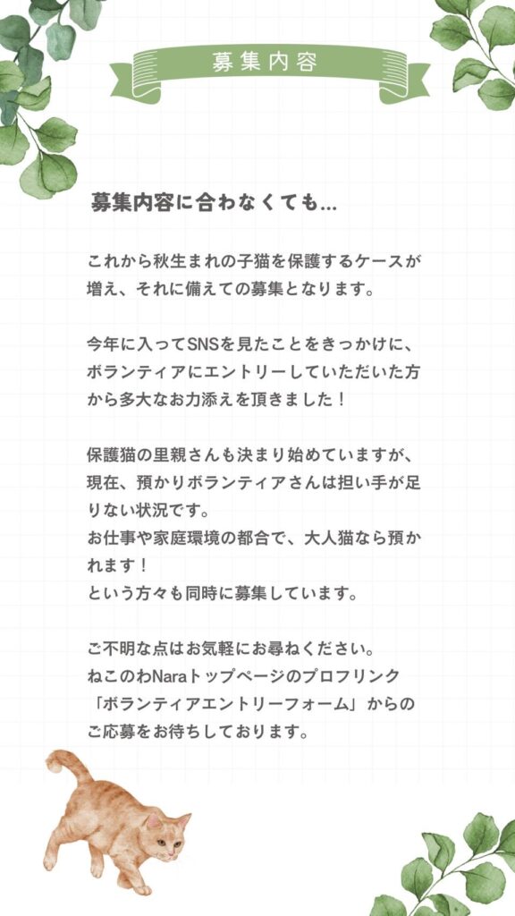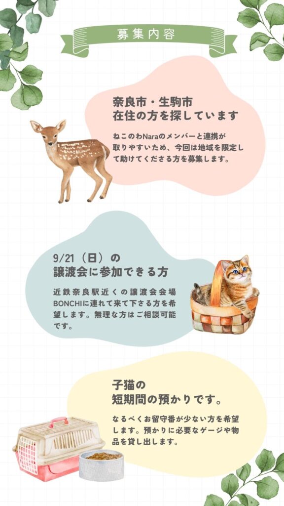 ねこのわNaraの公式HPの「お問合せ」からご連絡ください。